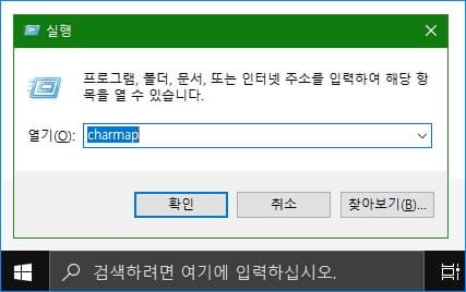 그곳에 'charmap'라고 입력하고 엔터키를 치면 문자표 프로그램이 실행됩니다.