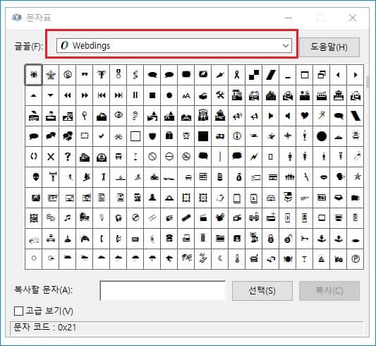 참고로 아래의 이미지는 전체 실행된 문자표에서 많이 쓰이는 'webdings'을 상단 드랍다운 메뉴에서 선택한 모습입니다.