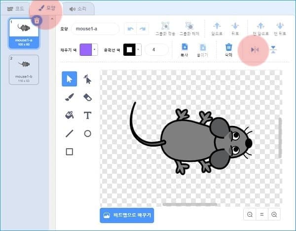 스크래치 창의 왼쪽 상단 탭 중에서 모양을 선택한 뒤 좌우 뒤집기를 선택합니다.