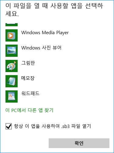 다른 앱 선택에서 추가 앱 선택하기를 누른 후 이 pc에서 다른 앱 찾기를 누릅니다. 이때 항상 이 앱을 사용하여 해당 파일을 열기에 체크가 되어 있어야 합니다.