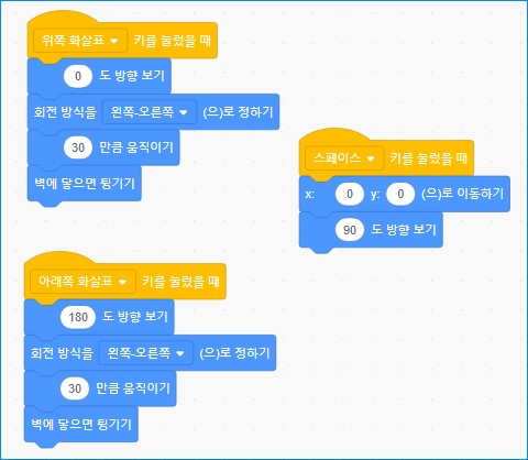 아래쪽 키의 블록 설정은 위의 블록 군을 복사한 뒤 '아래쪽 화살표 키를 눌렀을 때', '180도 방향 보기'로 바꾸어 주면 됩니다.