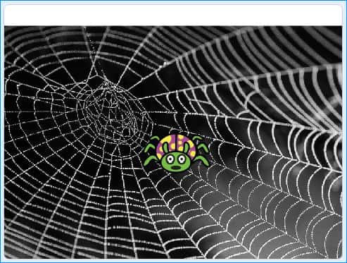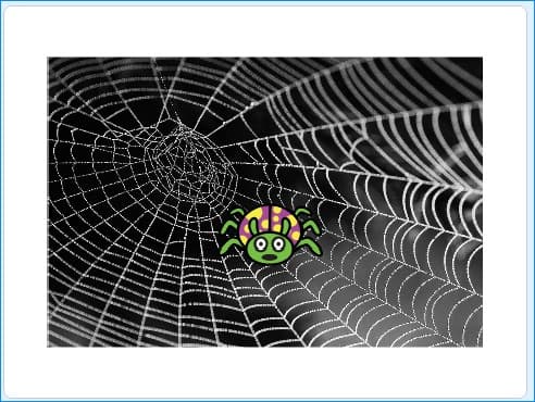 (예제) 거미줄에서 거미가 키보드의 상하 키에 반응하여 위아래로 30의 속도로 움직이게 만들고 스페이스바를 누르면 좌표 (-150, 100) 지점으로 이동하게 하시오. 또한, 배경은 거미줄 이미지를 배경으로 사용하세요.