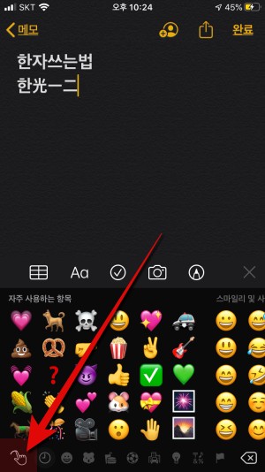 아이폰에서 텍스트를 입력하는 환경에서는 아래에서 키보드가 올라옵니다. 이때 한영변환은 지구본 모양을 클릭했었는데 이때 지구본으로는 한글키, 영문 키, 이모티콘 키 간의 자판 변환이 이루어집니다. 이때 이모티콘 키조합이 올라올 때 좌측 하단의 손가락 모양을 클릭하면 한자 입력 모드로 전환됩니다.