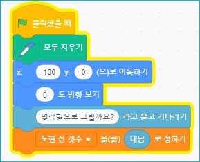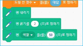 - 변수 팔레트에서 '도형 선 개수를 0으로 정하기' 블록을 가져옵니다. 그리고 '0' 부분에 넣을 블록으로 감지 팔레트에서 '대답' 블록을 가져와 넣습니다.