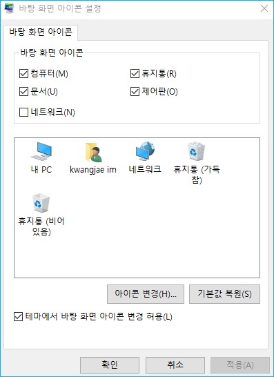 설정창에서 체크가 되어 있으면 바탕화면에 아이콘들이 보여지고 체크가 되어 있지 않는 것은 보여지지 않습니다.