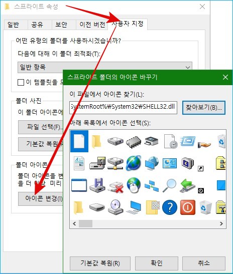 윈도우즈10 일반 아이콘 변경과 드라이브 아이콘 변경하기