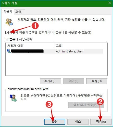 저의 경우에는 윈도우즈10에 자동 로그인 기능을 사용하고 있어서 기본적으로 체크가 해제되어 있습니다. 자동 로그인 과정을 다시 한번 반복하기 위해 사용자 이름과 암호를 사용해야 로그인할 수 있음에 체크하고 적용 및 확인을 눌러 줍니다.