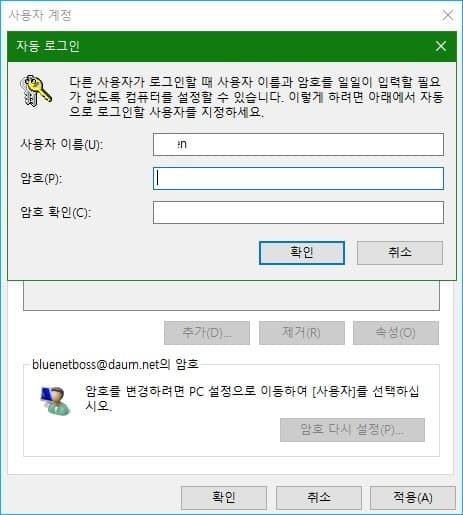 체크를 해제하고 적용을 누르면 자동 로그인 계정 및 암호 입력창이 나옵니다.