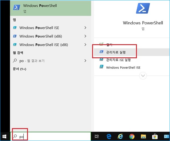 명령 프롬프트 창이 닫히고 나면 아래의 그림처럼 작업표시줄에 po라고 입력한 뒤 위에서 파워셀 관리자 모드를 실행시킵니다.
