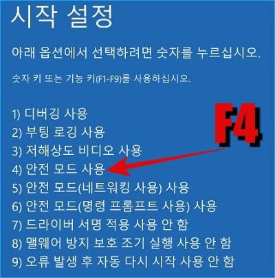 다음으로 재시작 버튼을 누릅니다. 시작 설정창이 뜨면 f4키를 눌러 안전모드로 진입합니다.