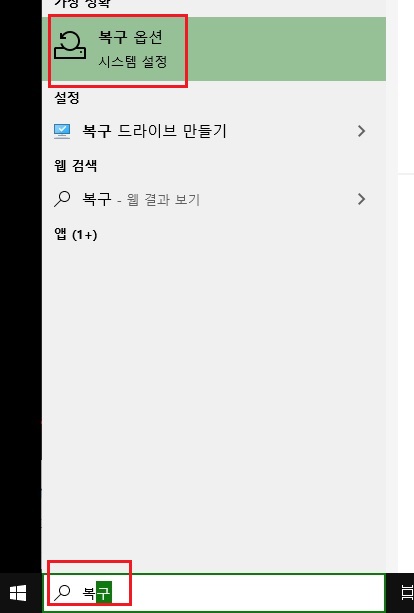 아래의 이미지와 같이 작업표시줄의 검색란에 복구라고 타이핑하여 복구 옵션을 실행시킵니다.