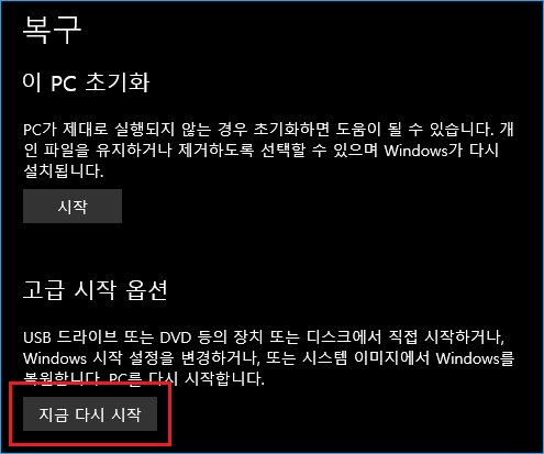 복구 옵션을 누르면 윈도우즈 설정의 복구 창이 열립니다. 고급 시작 옵션의 지금 다시 시작 버튼을 누르세요.