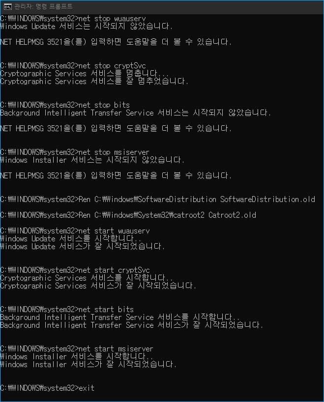 "Windows Update 서비스는 시작되지 않았습니다. NET HELPMSG 3521을 입력하면 도움말을 더 볼 수 있습니다."라는 메시지가 출력됩니다.