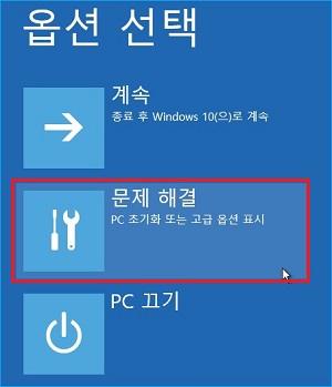 계속을 누르신 다음 옵션 선택창에서 문제 해결을 클릭합니다.