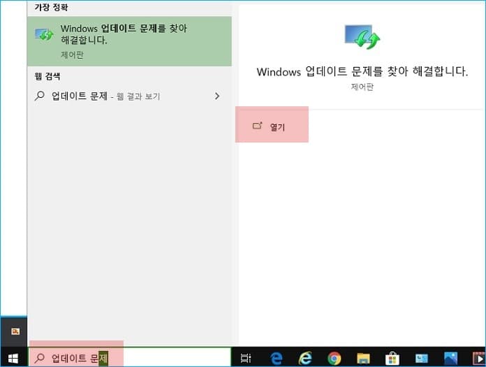 윈도우즈 작업표시줄에서 검색창에 업데이트 문제 해결사라고 타이핑한 뒤 열기를 눌러 문제 해결사를 실행합니다. 팝업 된 창에서 다음 버튼을 누르면 윈도우즈 업데이트 오류와 관련해서 해결할 수 있는 문제가 있는지 자동으로 점검합니다.