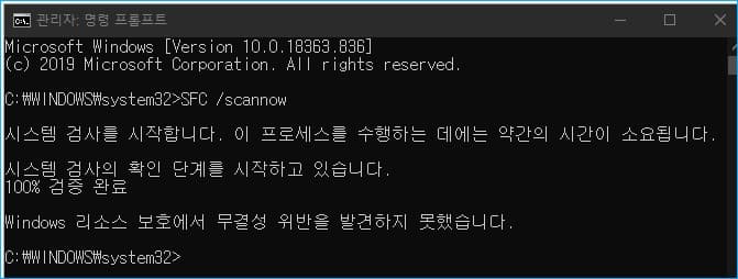 - Windows 리소스 보호에서 무결성 위반을 발견하지 못했습니다.