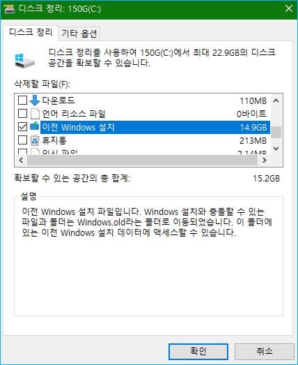 이전 윈도우즈 설치 파일인 Windows.old 폴더를 삭제합니다.