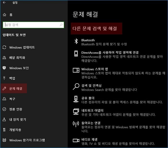 윈도우즈 설정에서 업데이트 및 보안으로 이동한 다음 목록 중간의 문제 해결을 클릭합니다.