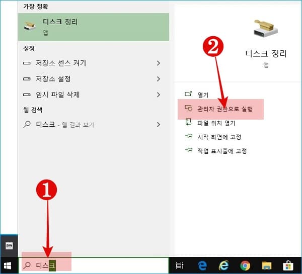 디스크 정리는 디스크에 저장된 임시파일에 의해 문제가 발생했을 가능성을 확인하기 위해 실시합니다. 윈도우즈 작업표시줄의 검색창에 디스크 정리라고 입력한 후 관리자 권한으로 실행합니다.