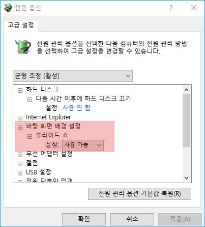 다음으로 뜨는 전원 옵션 창에서 고급 설정 항목 내용 중에 바탕 화면 배경 설정 항목이 있습니다.