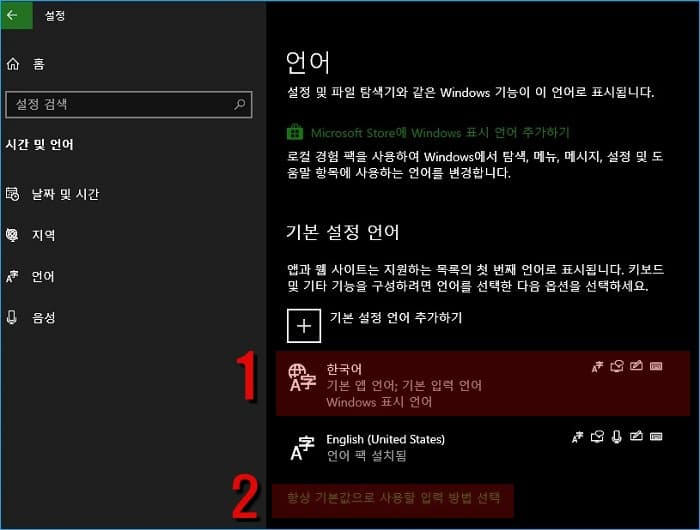 기타, 영문윈도우에서 입력만 한글로 하고 싶은 경우에는 시간 및 언어 설정을 누른 뒤 언어 설정 항목에서 상단의 Windows 표시 언어는 영어로, 하단의 기본 설정 언어는 한국어로 하면 됩니다.