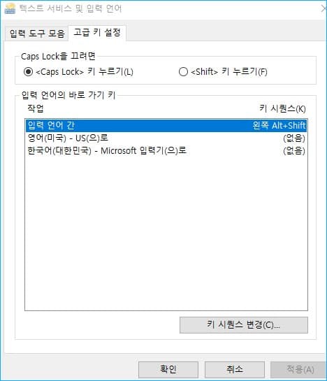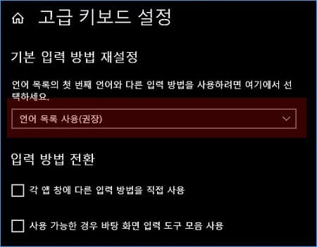아래의 이미지와 같이 '고급 키보드 설정' 에서 권장 기본값인 '언어 목록 사용'으로 선택하시기 바랍니다.