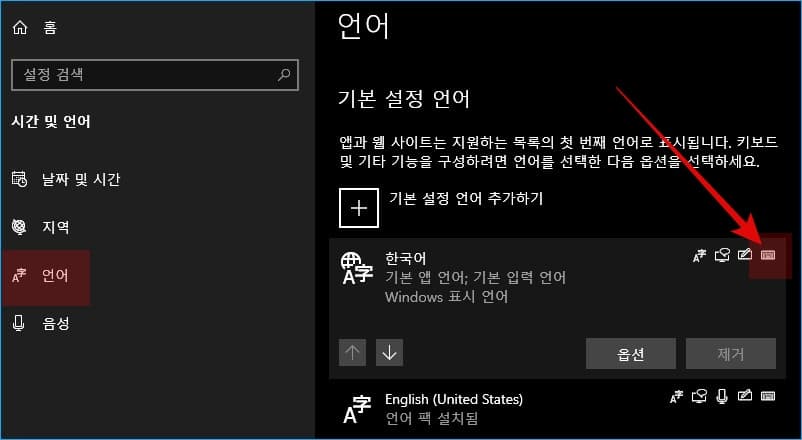 2. 언어로 들어간 다음 기본 설정 언어 항목에서 한국어 팩 우측 끝쪽에 키보드 모양 아이콘을 클릭합니다. 그러면 옵션 버튼이 나옵니다. 옵션 버튼을 클릭합니다.