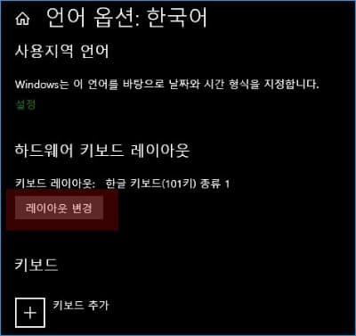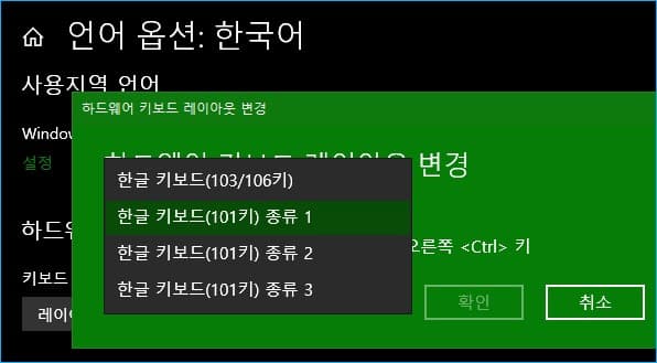 윈도우10을 사용하는 경우 시작- 설정 - 시간 및 언어 - 언어 - 한국어의 옵션 - 레이아웃 변경 - 하드웨어 키보드 레이아웃을 한글 키보드(101키) 종류 1로 선택합니다.