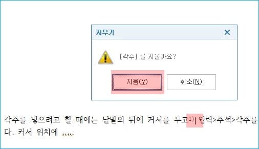 본문에서 각주 번호를 지우면, 그 번호에 해당하는 각주 내용도 모두 함께 지워집니다. 각주 번호는 보통 문자와 같이 Delete키나 Backspace키를 눌러 지울 수 있습니다.