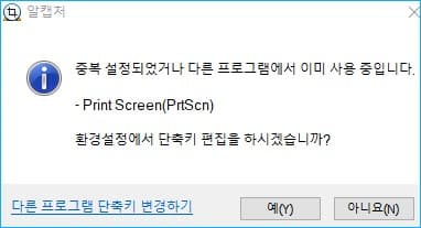 ▶ 알캡쳐 환경설정 > 단축키 설정 > PrintScreen키를 ~기능으로 사용 체크 해제