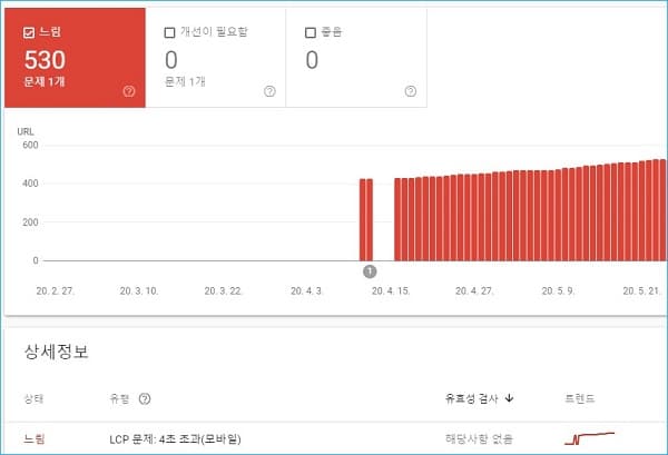 제가 이렇게 까지 하게 된 이유의 발단은 구글 콘솔입니다. 아래의 구글 콘솔 보고서처럼 스킨 교체 이후 갑자기 400개 이상의 느린 속도 증상이 나타나더니 약 한 달 후 백개 정도가 더 늘어납니다. 원인은 여기에서 비롯되었지만 결과적으로는 Jb167 스킨에서 댓글 관련 요소 자체를 없애 버려야 했고, 오늘은 그 방법을 포스팅하고자 합니다.