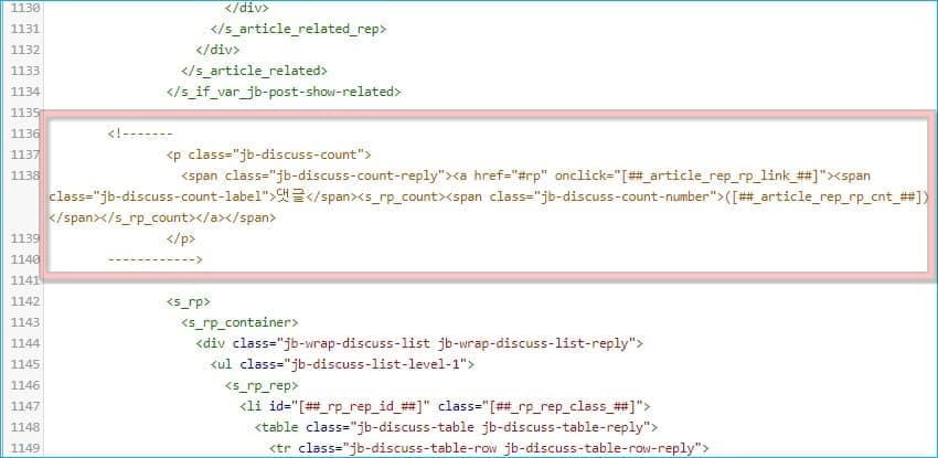 아래의 이미지처럼 jb-discuss-count 라고 Ctrl + F로 검색창을 띄워 검색하거나 대략 1136번 줄쯤으로 스크롤을 내리면 해당 부분이 나옵니다. <p class="jb-discuss-count"> 부분부터 </p>까지 의 부분을 주석 문(<!----로 시작해서 ----->로 닫아줌)을 달아 기능을 삭제시킵니다.