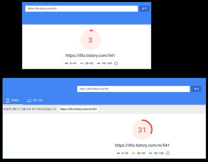 결론적으로 모바일 환경에서의 원하는 디자인을 모두 포기하고 오로지 속도에 올인하겠다고 하시는 분들은 티스토리의 모바일 환경 연결을 사용함으로 설정하여 리디렉션 되게 하는 것도 한 방법이라는 생각이 듭니다. 왜냐하면 반응형 스킨을 쓰고 있을 경우에 속도 차이가 모바일 연결 리디렉션을 사용하게 될 경우의 속도 향상이 어마무시하니까니요.