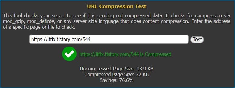 나의 블로그가 정상적으로 압축되고 있는지를 테스트 해보시려면 압축 테스트 사이트로 이동하신 뒤 자신의 임의의 블로그 페이지 주소를 넣어 보면 cdn에서 압축이 이루어지고 있는지 등을 알아보실 수 있습니다.