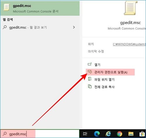 작업표시줄의 검색창에 gpedit.msc라고 입력한 뒤 로컬 그룹 정책 편집기를 실행합니다.
