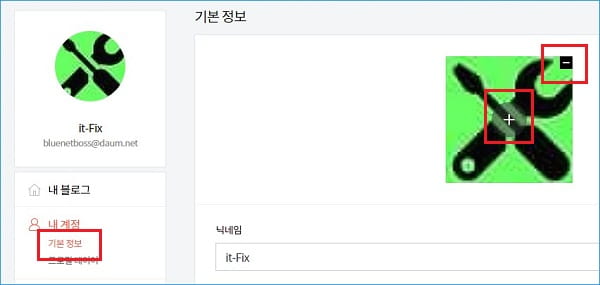 계정 설정 아이콘을 누르고 하단의 계정에 속해 있는 블로그들 설정 메뉴가 아닌 상단 이메일 주소 옆의 계정 관리를 클릭합니다. 계정 관리를 누르고 들어가면 운영 중인 블로그들의 목록과 몇 개의 블로그가 더 개설할 수 있는지 설명하는 페이지가 나옵니다. 좌측의 메뉴에서 기본 정보 메뉴를 클릭하시면 프로필 이미지를 교체하거나 삭제 또는 수정할 수 있는 페이지가 나오는 데 이 페이지에서 모든 작업을 수행해 주시면 바로 적용됩니다.