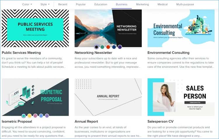 다소 화려하면서도 세련된 원색을 많이 사용하고 깔끔한 실사 디자인도 많습니다. 사무용 템플릿을 원하신다면 검색창에 business라고 타이핑하면 스몰 비즈니스, 글로벌 비즈니스 등 많은 하위 항목들이 검색되는 데 이러한 방식으로 원하는 템플릿을 찾아서 다운로드할 수 있습니다.
