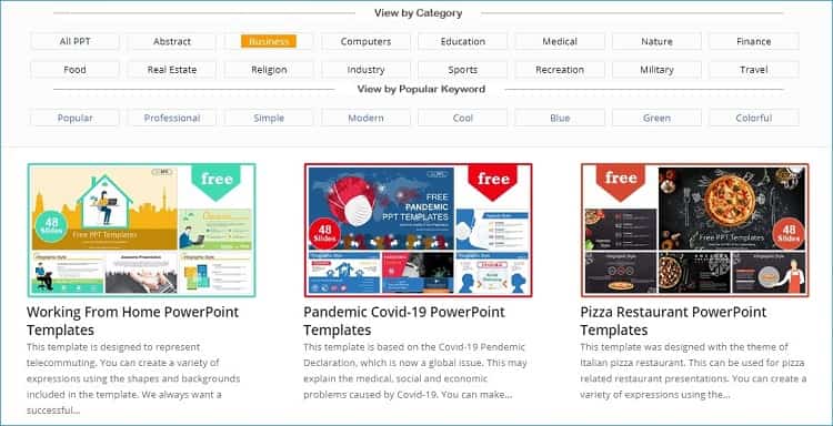 대부분의 ppt 템플릿 사이트들과 마찬가지로 많은 카테고리를 가지고 있으며 원하는 카테고리에서 적절한 템플릿을 선택한 후 다운로드 할 수 있습니다.