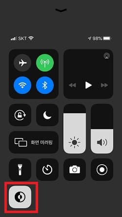제어센터에서 빠르게 다크 모드를 켜거나 밤에 자동으로 켜지도록 설정할 수도 있습니다. 다크모드를 켜면 사용자 기기의 조명이 주변의 다른 사람들을 방해하지 않습니다. 아이폰을 아래에서 위로 쓸어 올리면 나오는 제어 센터에서 다크 모드 아이콘은 아래의 이미지와 같이 생겼습니다.