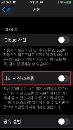 3. 사진 설정에서 사진 스트림 끄기