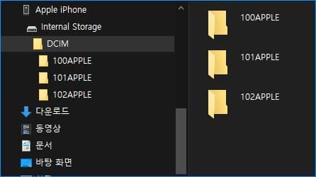 100, 101, 102... 이 순서로 나가는 폴더들에 사진이 저장되어 있습니다. 저는 복사가 아닌 잘라내기를 선택하여 파일을 백업하였습니다. 물론 아이클라우드와의 연동은 끊어져 있어야 아이폰이 또다시 생성시키지 않습니다.