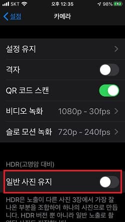 HDR을 자동으로 설정해 두고 카메라를 사용하는 경우에는 카메라 설정의 일반 사진 유지를 켜 둘 필요가 없습니다. HDR 사진만으로도 충분하므로 일반 사진을 더불어 저장할 경우에는 공간의 낭비를 초래하게 됩니다.