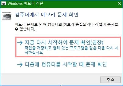 - 윈도우즈 메모리 진단 창에서 지금 다시 시작하여 문제 확인(권장) 클릭