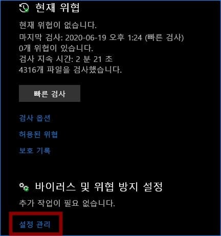 디바이스에서 허용하는 상태로 만든 다음 바이러스 및 위협 방지 설정 항목의 설정관리를 클릭해 들어갑니다.