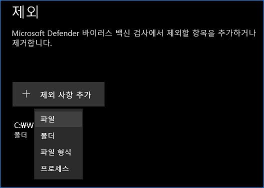 제외 사항 추가에서 파일을 선택합니다.