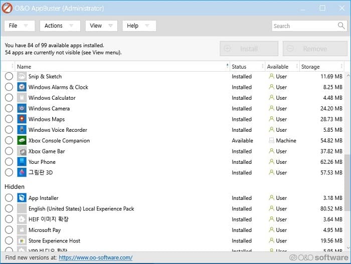 O&O AppBuster는 무설치 프로그램으로 설치에 대한 부담이 없으며 자동으로 관리자 권한으로 실행되므로 다운로드한 즉시 실행하면 됩니다. 아래의 이미지는 앱 부스터 첫 실행화면인데 외관에서 짐작되다시피 한방에 없애야 할 다른 것들도 한꺼번에 저세상으로 보낼 수 있다는 장점이 있기 때문에 이 방법을 선택한 이유이기도 합니다.