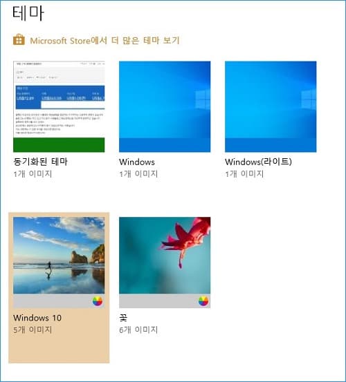 윈도우즈 설정 > 개인 설정 > 테마 > 테마 변경에서 Windows 10, 꽃 등과 같은 윈도우 설치 시 기본으로 등록되어 있던 테마 중 하나를 선택하시기 바랍니다.