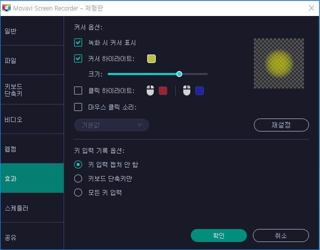 - 녹화하는 비디오의 프레임 속도, 오디오 품질 등을 마우스 드래그로 쉽게 지정할 수 있고 효과 옵션 항목에서는 강의나 강좌 등에서 많이 사용하는 마우스 커서 주위의 노란 테두리 옵션을 설정하고 커서 하이라이트 원의 색상, 크기 등을 조절할 수 있으며 딸깍하는 마우스 클릭 소리를 강좌 영상에 삽입할 수도 있습니다.