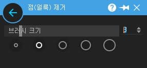 브러시 크기를 너무 크게 하면 윤곽이 남을 수 있고, 너무 작게 하면 제거 효과가 너무 미미하게 나타날 수 있습니다. 가장 적당한 작은 크기를 선택해야 하는 데 가능하면 아래 규격화된 5가지의 크기를 선택하지 말고 브러시 크기 슬라이드 바의 우측에 있는 상하 화살표를 클릭하여 세밀하게 크기를 조절합니다. 또한 브러시를 찍을 때 가능하면 점의 외곽에서 안쪽으로 들어가며 찍는 방식이 좀 더 효과적이었습니다.