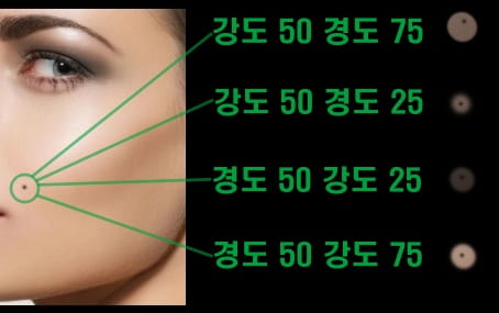 복제 도장 툴을 클릭하면 아래의 이미지처럼 브러시 옵션으로 브러시의 크기, 딱딱한 경도, 강도 등의 3가지 옵션이 나옵니다. 경도는 일종의 부드러운 가장자리와 선명한 가장자리의 크기를 말하며 복제되는 이미지 자체는 변화가 없습니다. 단지, 복제물의 테두리가 뷜러 상태인 지 샤프니스 상태인지만 나타냅니다. 강도는 원본을 어느 정도의 세기로 반영할지 나타내는 옵션으로 불투명도와 비슷한 개념입니다.